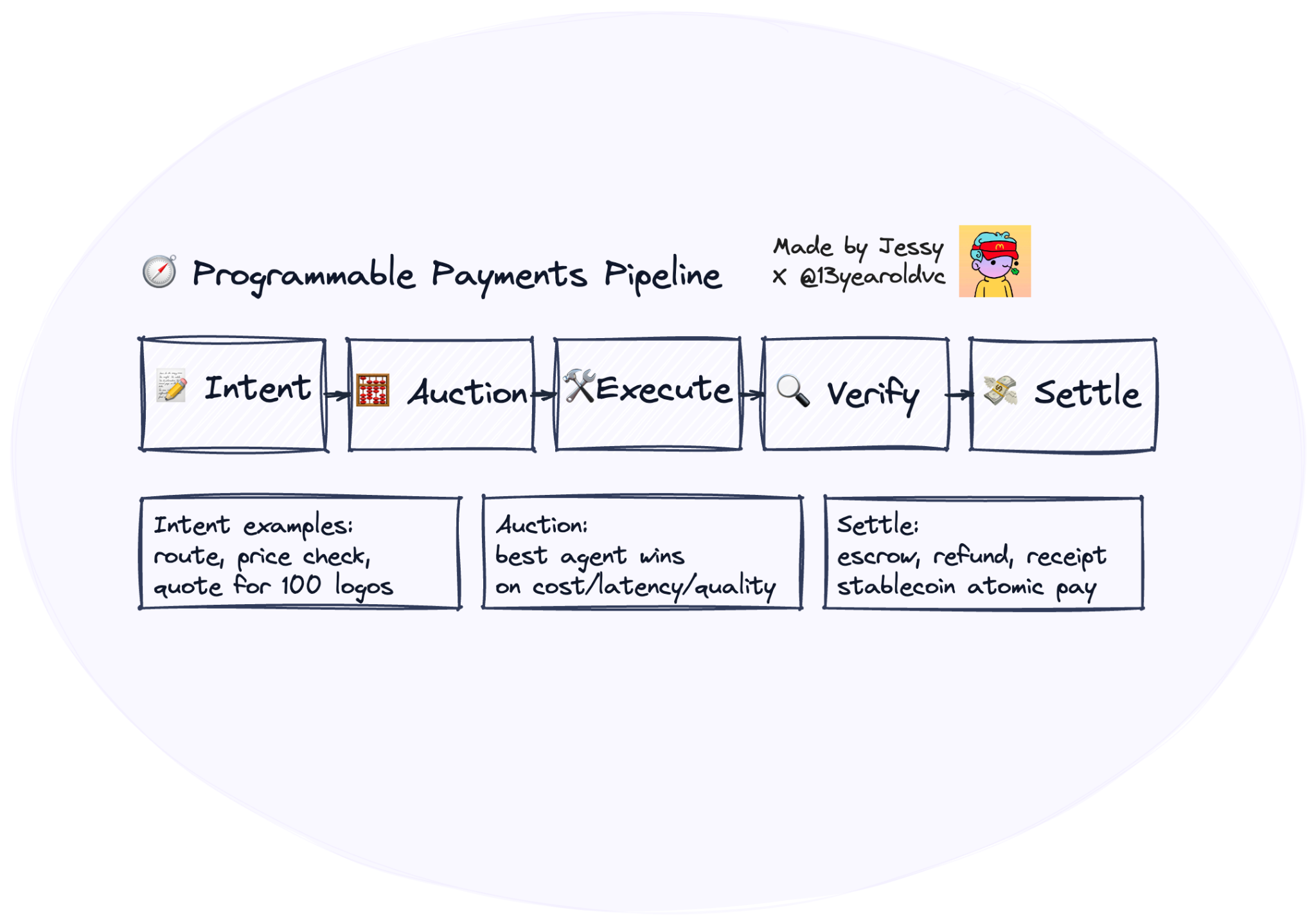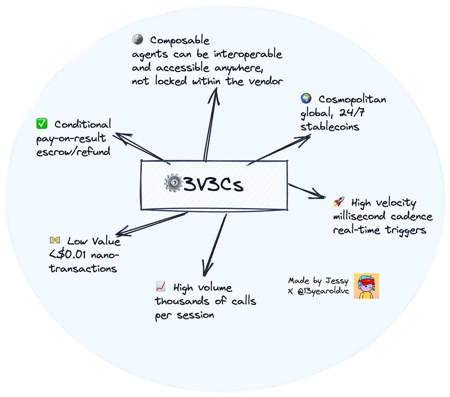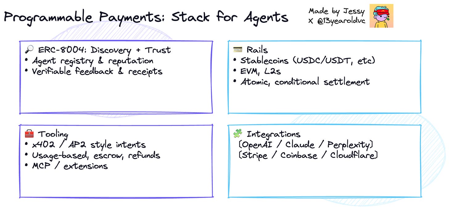 Another point on this is that decentralization previously was inefficient - parts of it was because humans are slow and coordination is costly. But now agents remove this bottleneck as they continuously evaluate who is best suited to act, what price is fair, and what data is trustworthy. Blockchains act as state coordination substrate - immutable, shared memory for results, stakes, and credits, while stablecoins are micro-payment rails for real-time value exchange (pay-per-answer, pay-per-action).