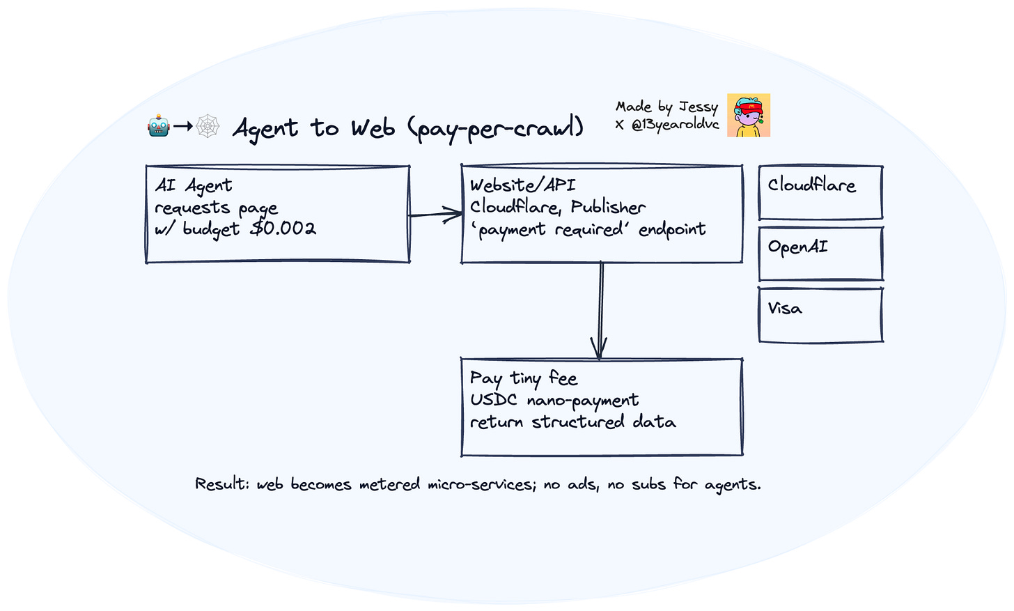 That’s where intermediaries like Cloudflare could flip the curve. If Cloudflare lets sites “turn on agent payments” with a single switch - handling authentication, metering, and settlement through protocols like x402 or Web Bot Auth - the barrier to entry vanishes. Cloudflare could simply detect authorized agent requests, charge nano-payments on behalf of the site, and distribute revenue automatically. In this model, the open web itself gains a native machine-commerce layer: any page can become a metered API, and any agent can pay seamlessly as it browses, crawls, or learns.