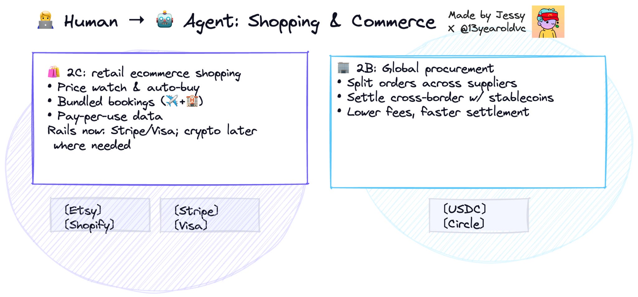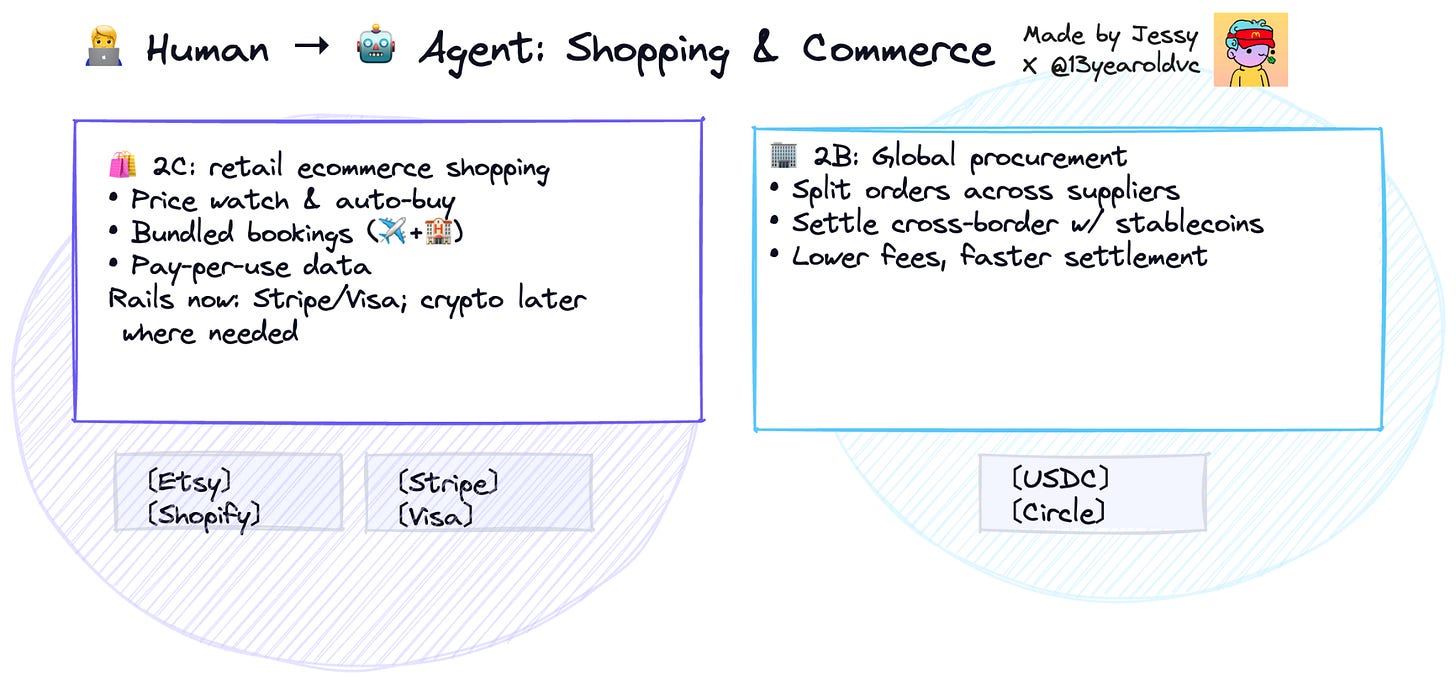 In the short term, most of these payments will probably still flow through legacy rails like Stripe or Visa - and that’s fine. For retail e-commerce (“2C”), the infrastructure is mature enough to handle the human-to-agent interface, at least for now.