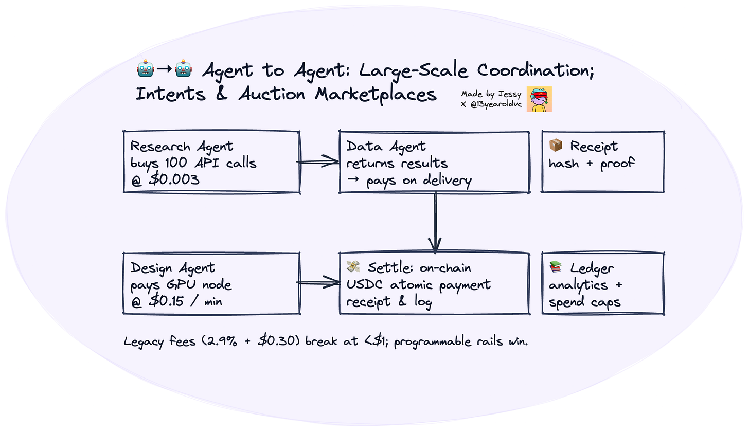 Hence, these are transactions that are too conditional, too high-frequency, need composability and too interdependent for humans or legacy rails to coordinate - but trivial for agents running on programmable payment systems.