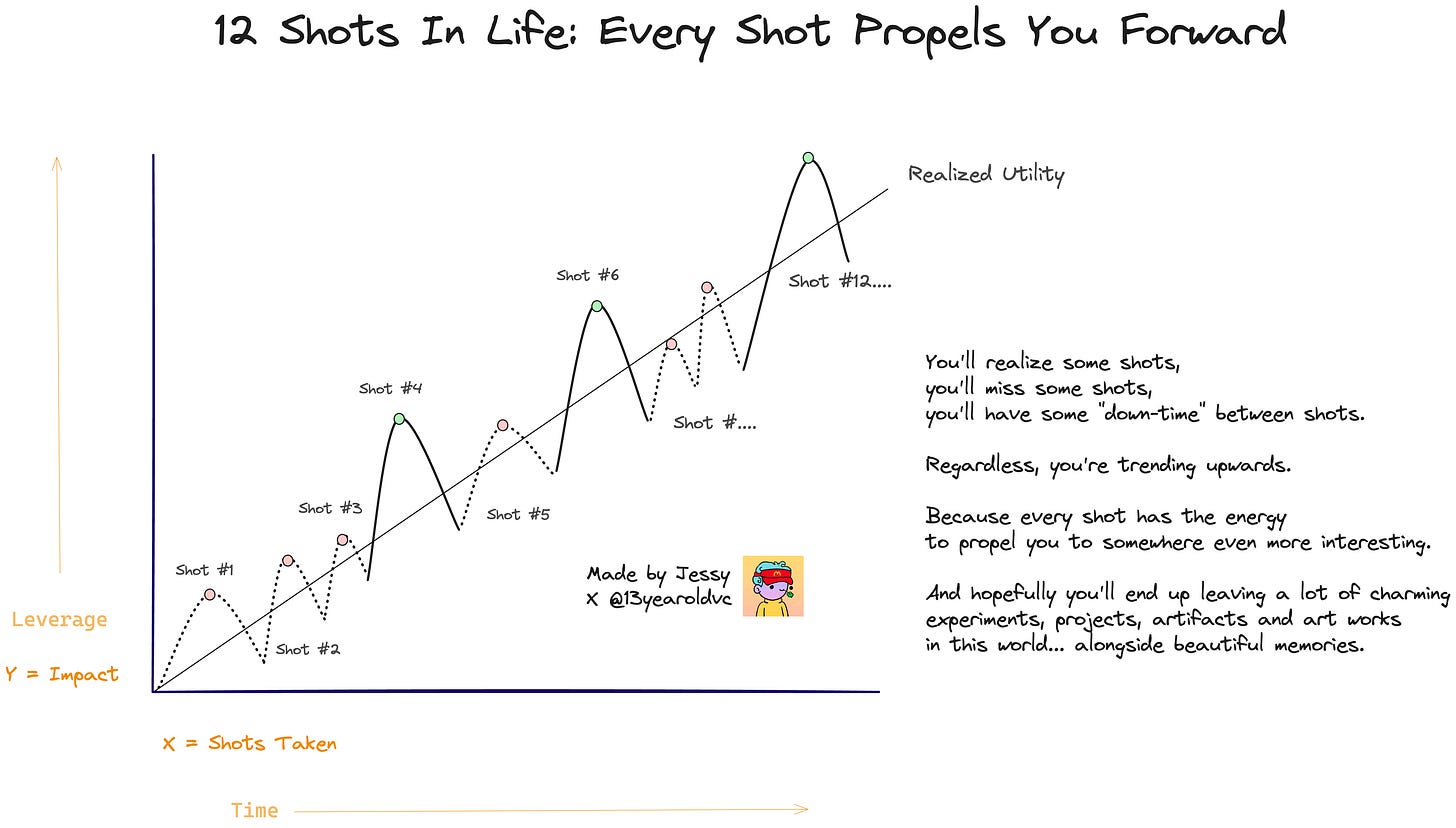 Each shot should expand your capabilities, compound your relationships, create lasting artifacts and position you for better future shots. Your shots should get bigger as you get better.